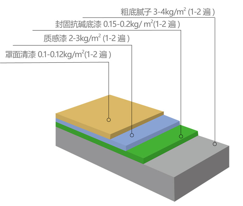 耗 漆 量 :理論值— 2-3kg/平方( 實際耗漆量會因施工方法、基層表面干硬程度和粗糙度及施工環(huán)境而有差異 )