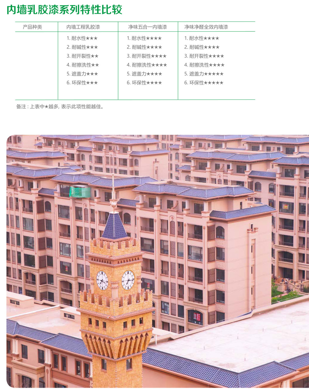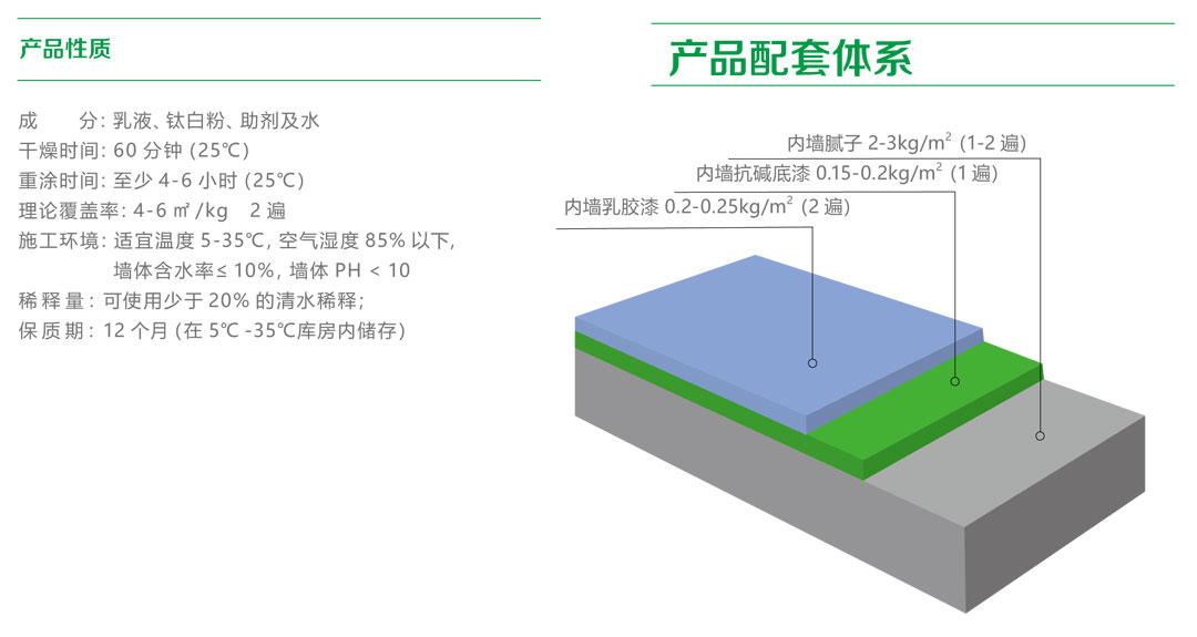 采用特別研發(fā)配方的健康環(huán)保型內墻乳膠漆,該產品易施工,耐臟易擦,防霉抗菌,適用于大眾建筑的內墻及各種柱、欄桿等裝飾造型,該產品健康環(huán)保,其揮發(fā)性有機化合物 VOC 含量遠低于國家頒布的相關標準。